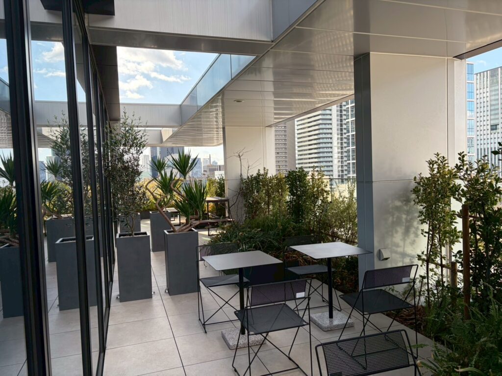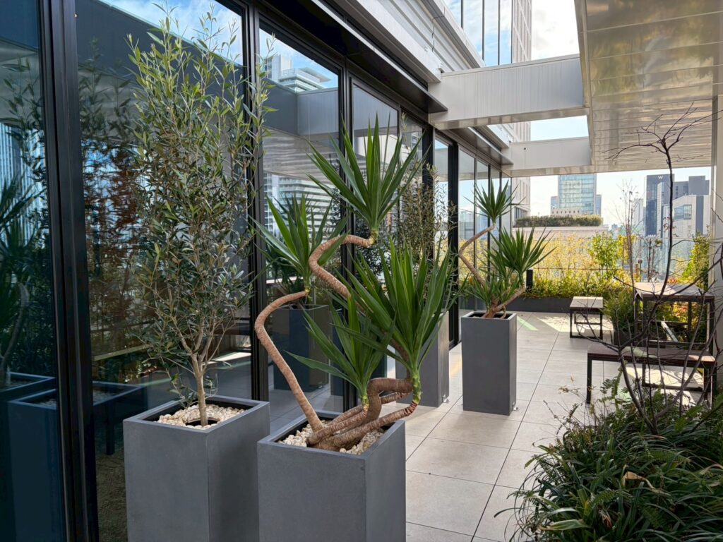 テラスにはユッカやオリーブなど寒さにも対応可能な観葉植物を配置します。